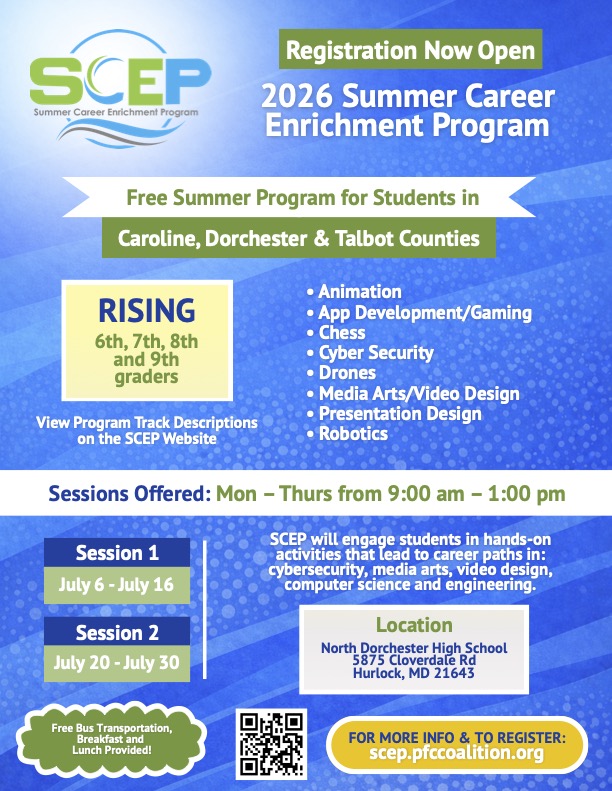 Open to rising 6th, 7th, 8th, and 9th graders in Caroline, Dorchester, and Talbot Counties on the Eastern Shore (view flyer)